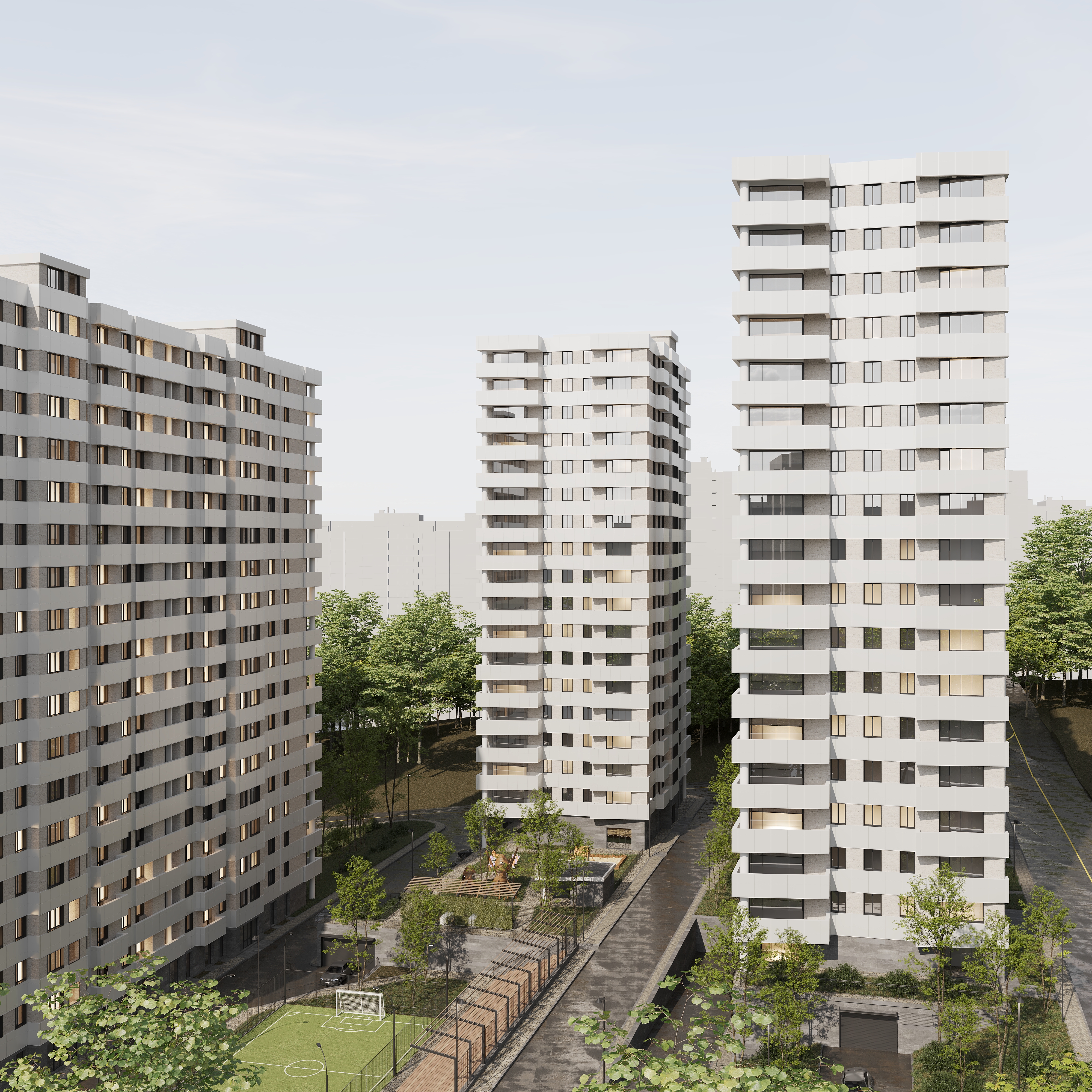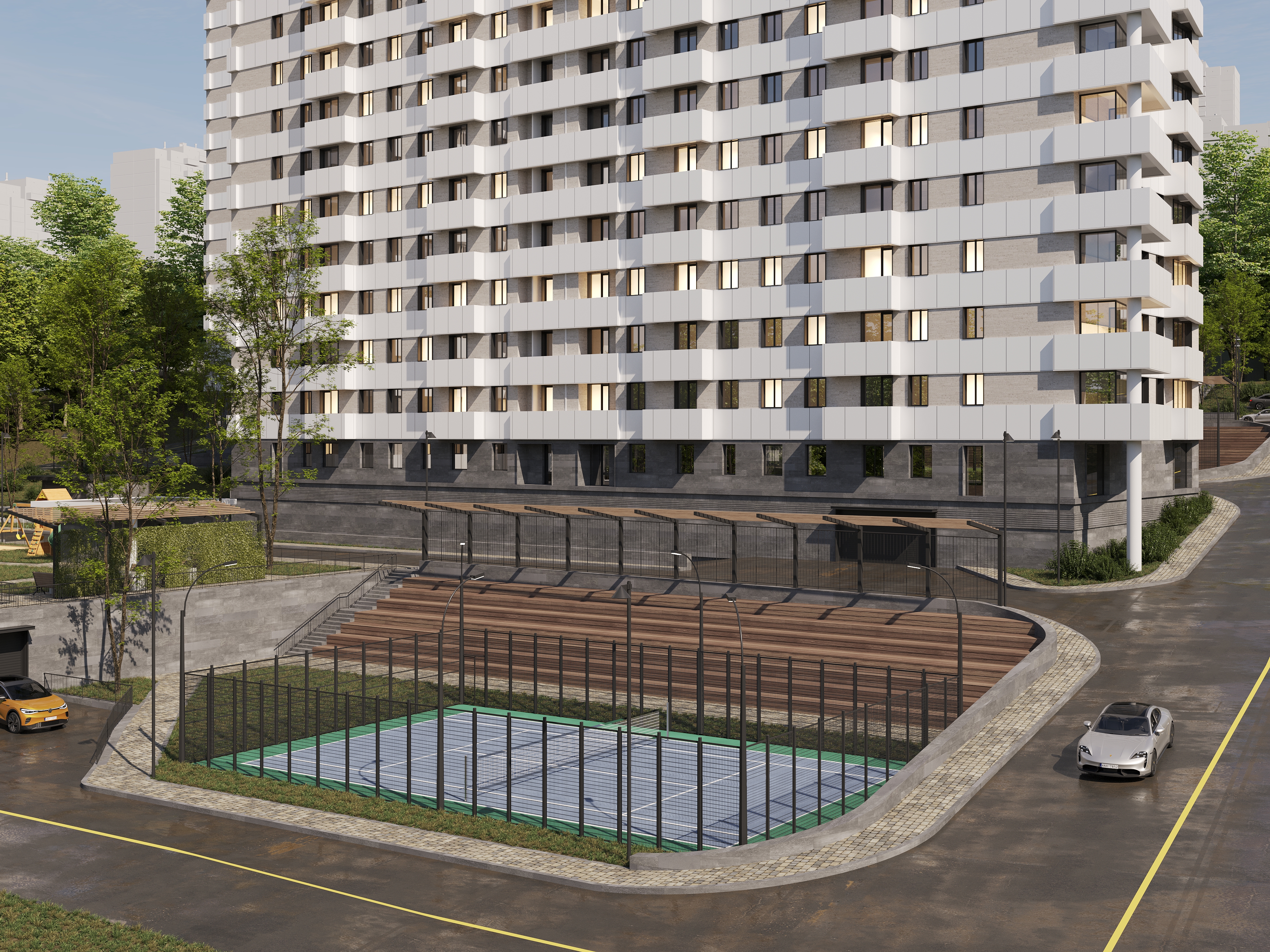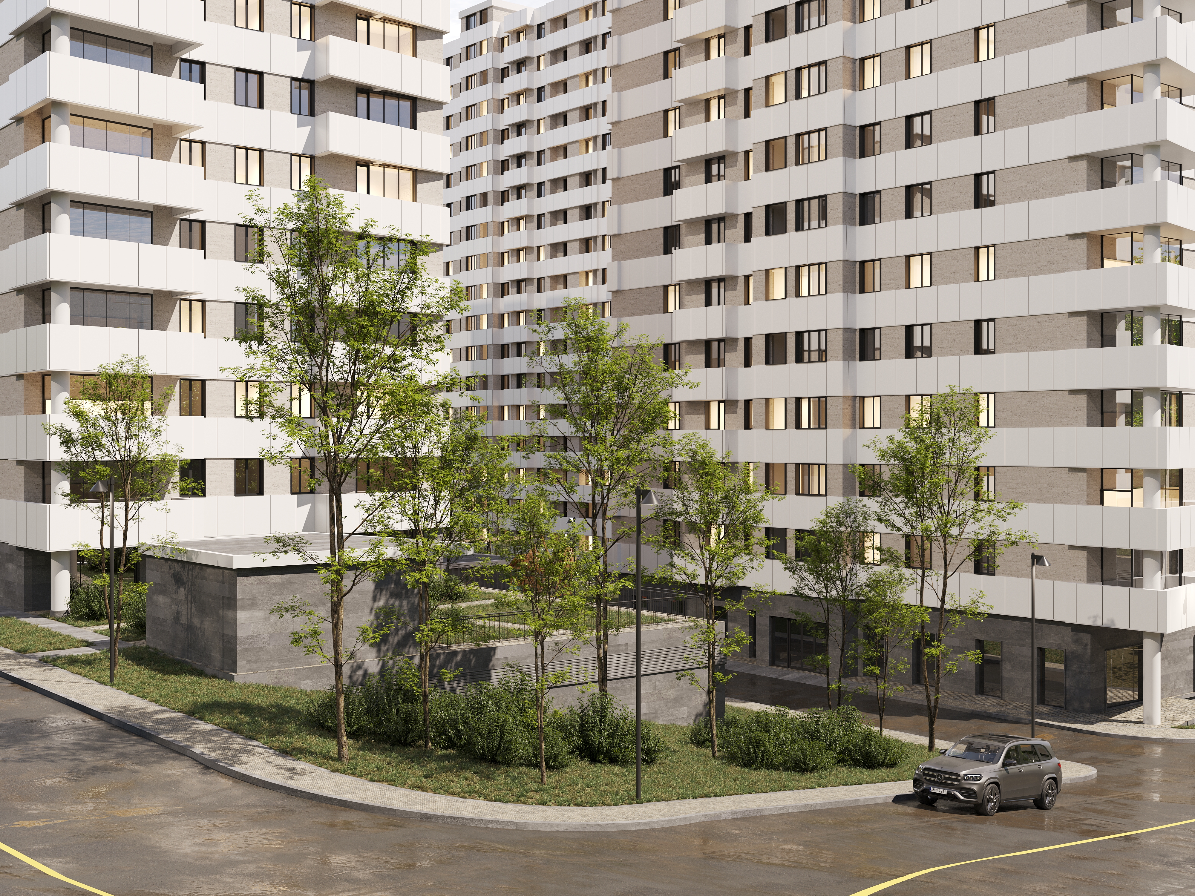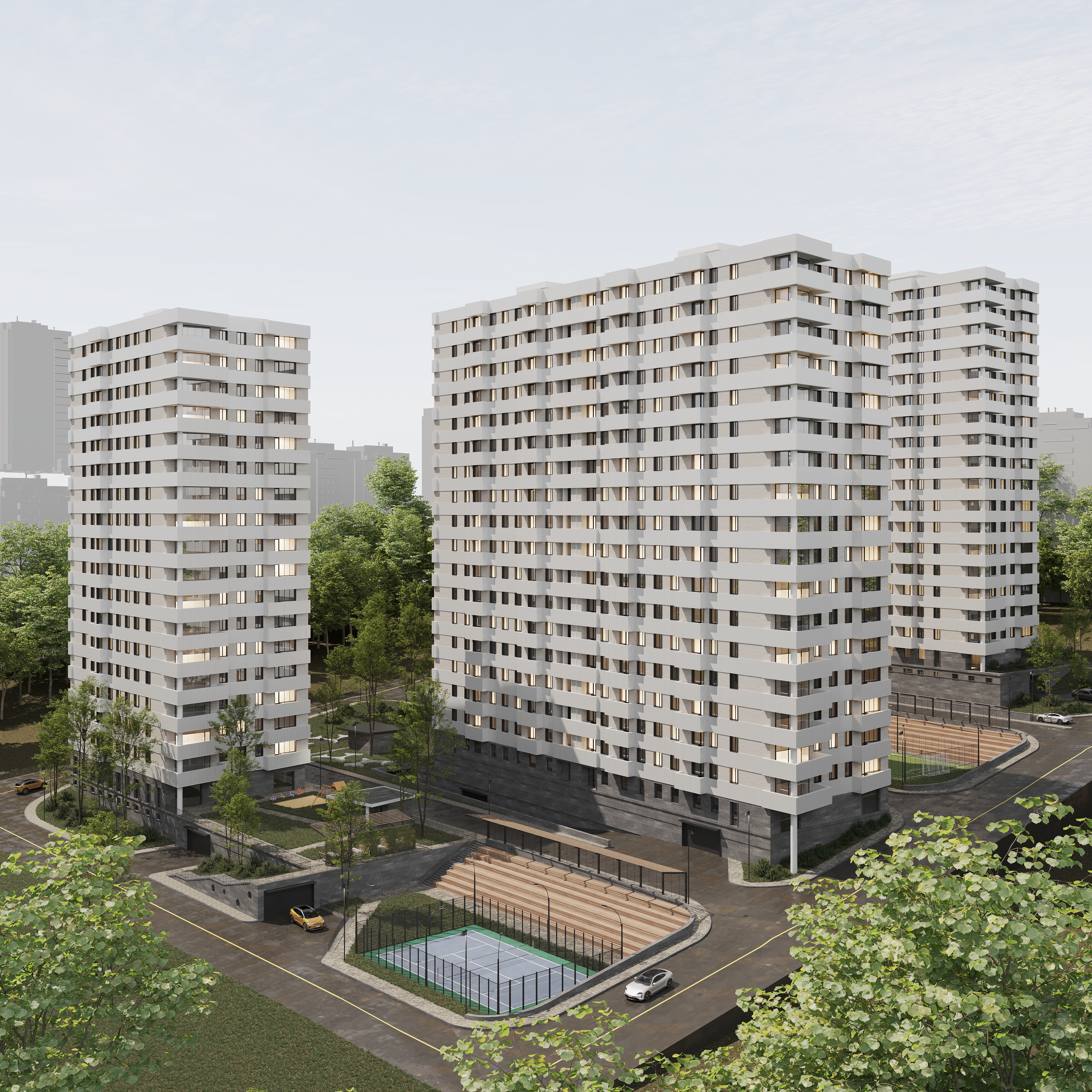 Թաղամասի կանաչապատ բակային տարածքում նախատեսված են սպորտային և մանկական խաղահրապարակներ, բացօթյա ավտոկայանատեղի: Շենքերի առաջին հարկերի հասարակական տարածքներում լինելու են մանկապարտեզ, դեղատուն և սուպերմարկետ։