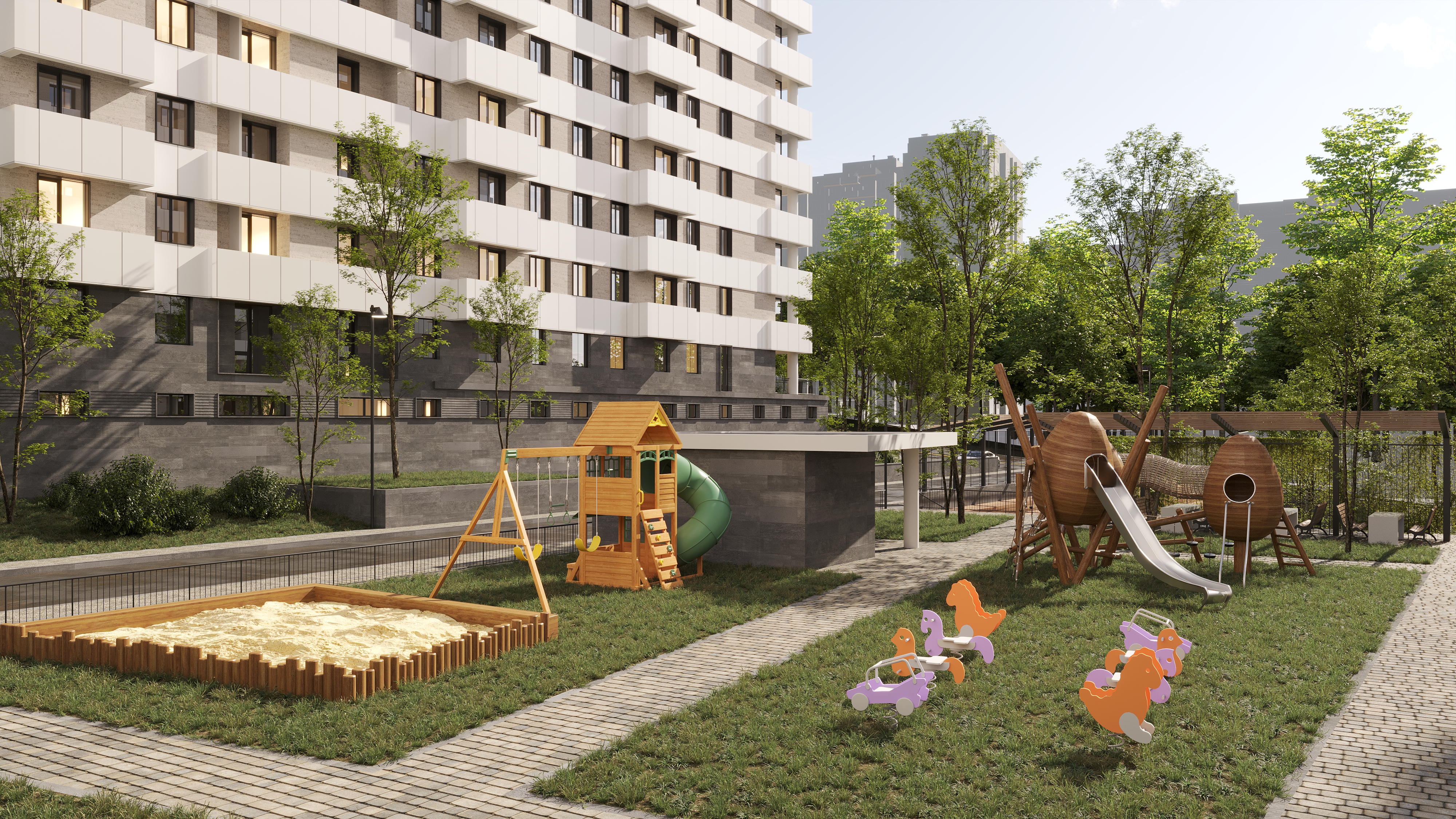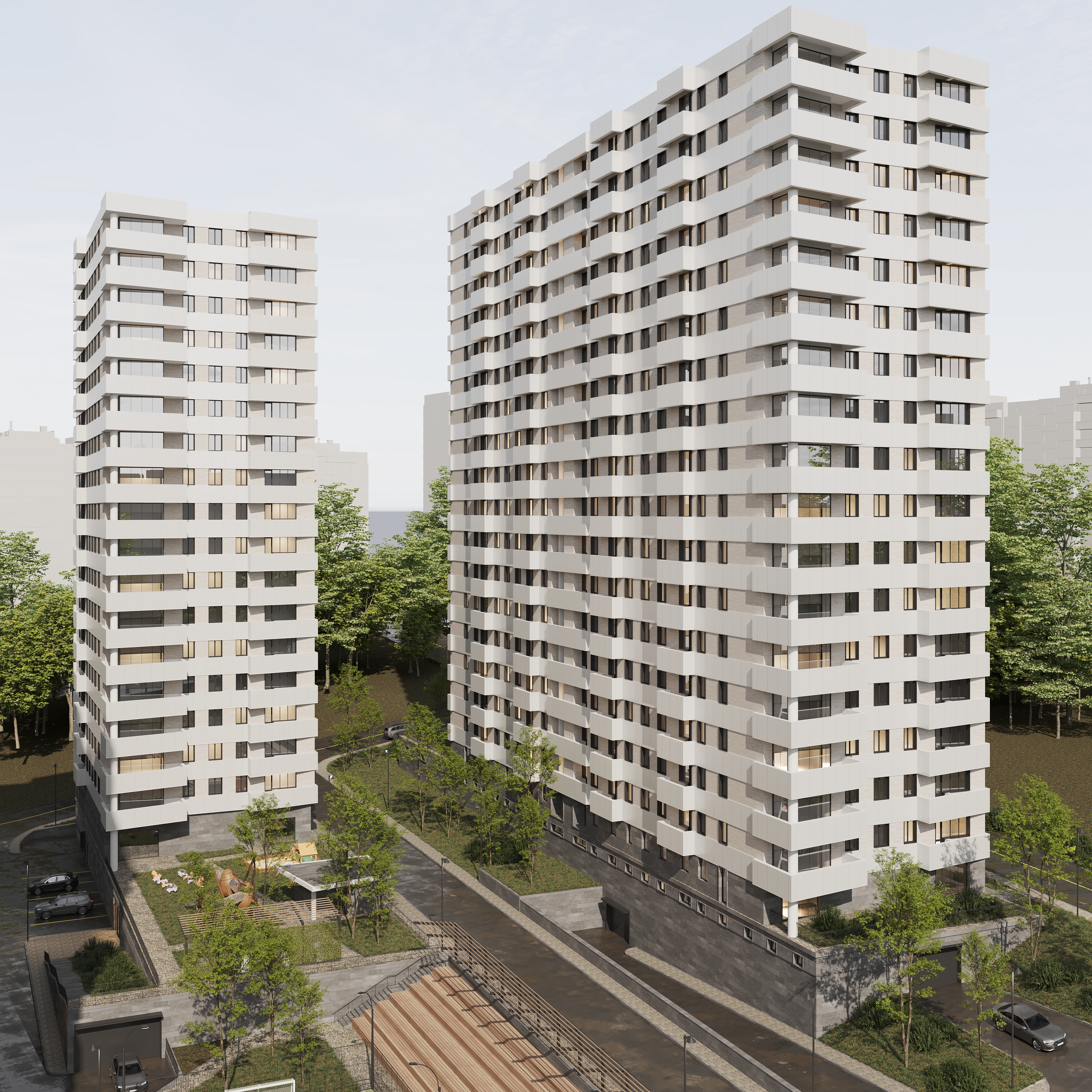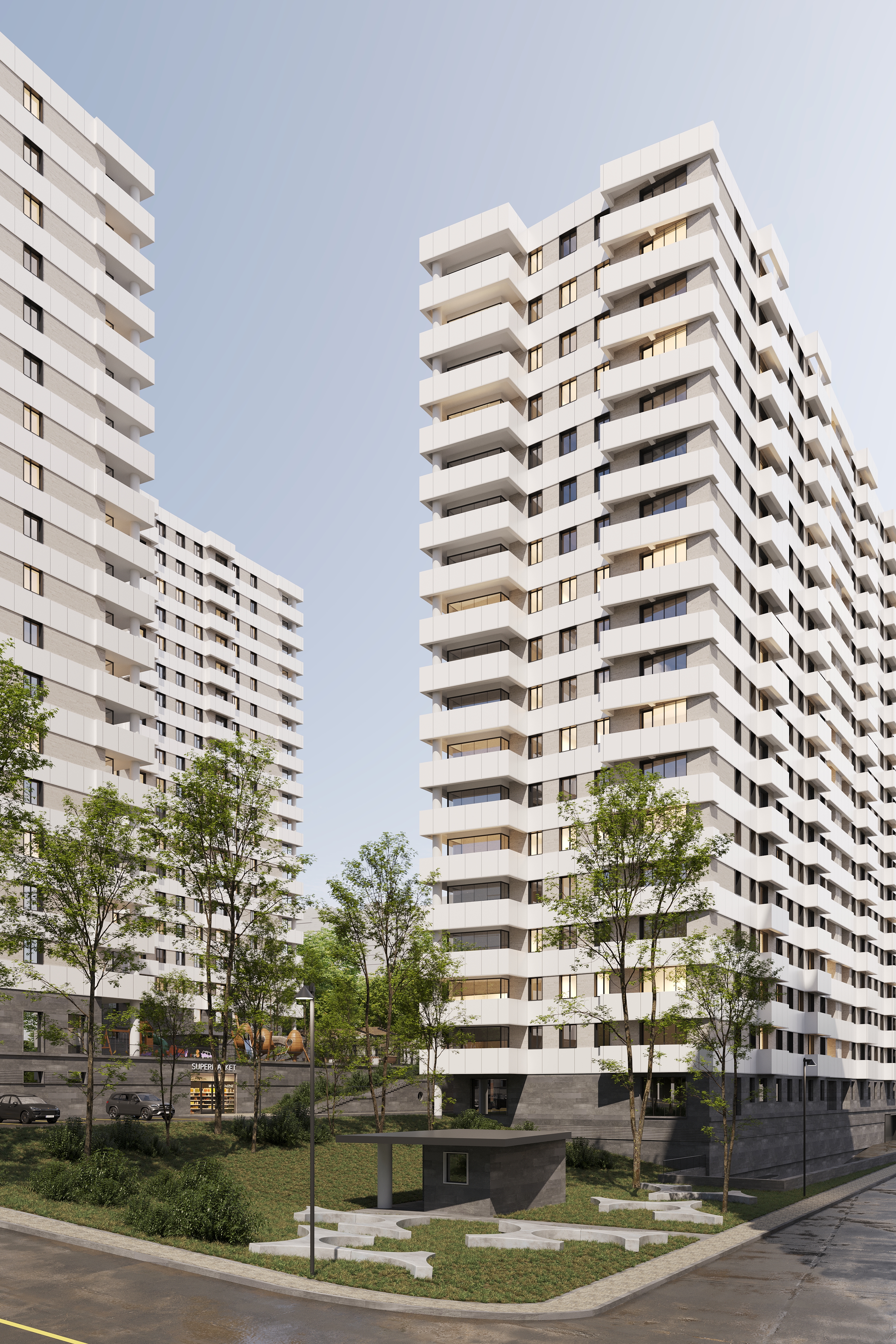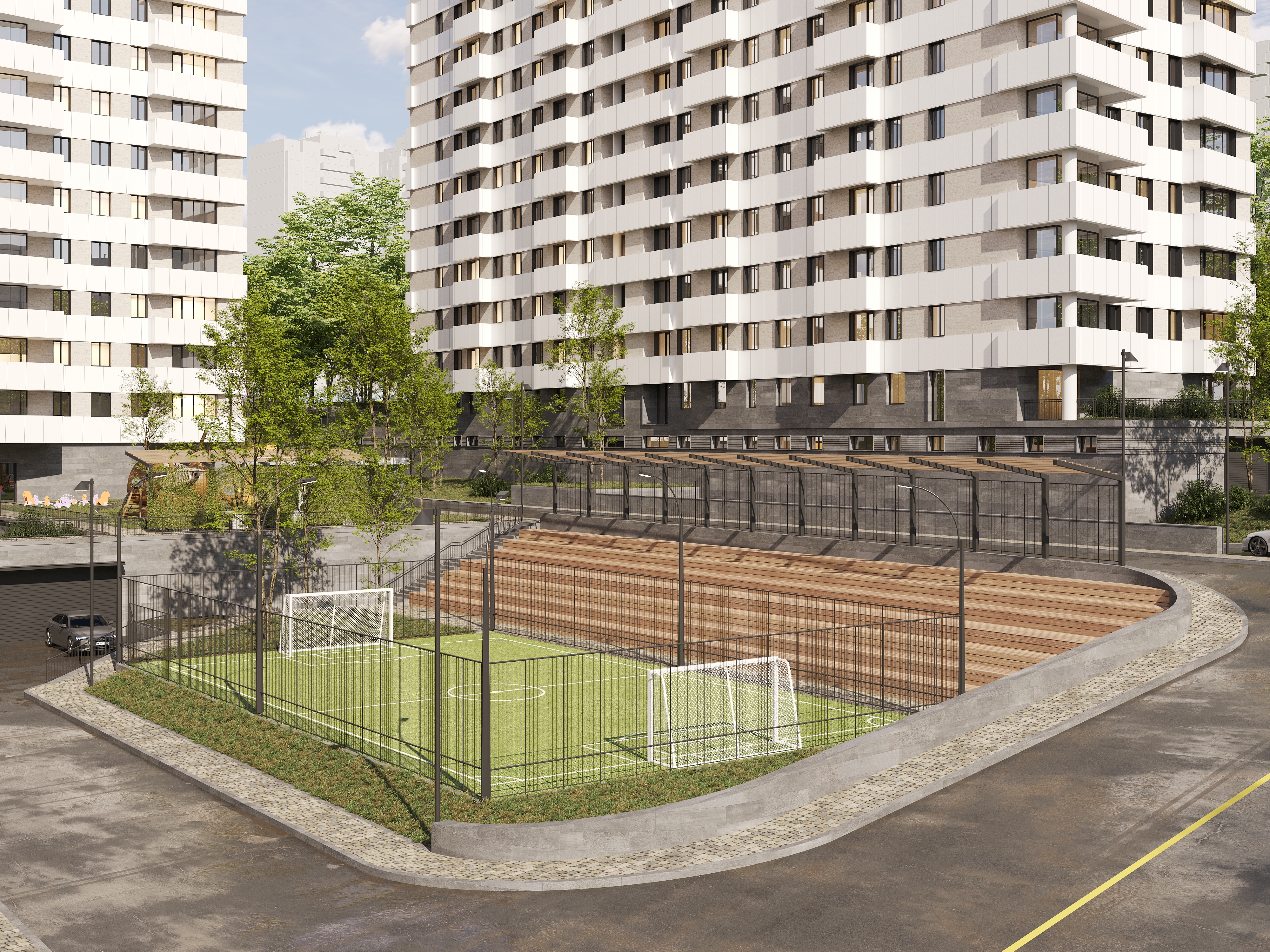 Թաղամասի կանաչապատ բակային տարածքում նախատեսված են սպորտային և մանկական խաղահրապարակներ, բացօթյա ավտոկայանատեղի: Շենքերի առաջին հարկերի հասարակական տարածքներում լինելու են մանկապարտեզ, դեղատուն և սուպերմարկետ։